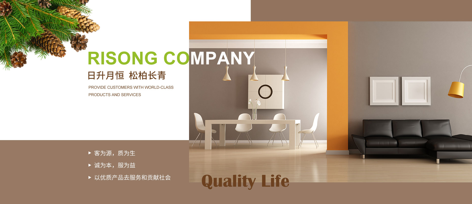大連日松將一直秉承“以優(yōu)質(zhì)產(chǎn)品去服務(wù)和貢獻社會”的經(jīng)營宗旨;“客為源,質(zhì)為生、誠為本、服為益”的經(jīng)營理念;達到“使用者、銷售者、制造者”三者并存共榮之經(jīng)營思路;全體日松人將以“熱情、禮貌、快捷、準確”的行動指南,不懈努力的為每一位客戶,提供行業(yè)內(nèi)一流的高端、環(huán)保、舒適、健康的產(chǎn)品和細節(jié)服務(wù),打造出適合“您”的優(yōu)質(zhì)家居住宅環(huán)境。